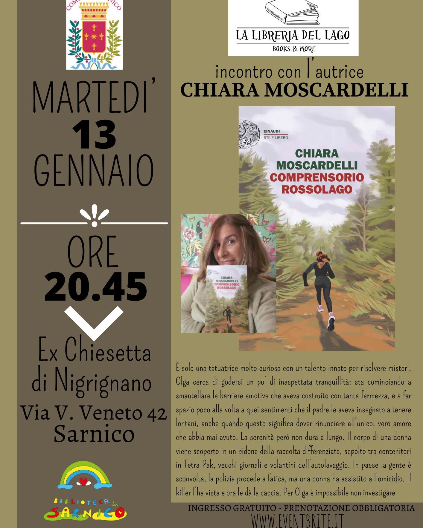 L’incontro è organizzato da La Libreria del Lago in collaborazione con l'Assessorato alla Cultura e Istruzione e della Biblioteca di Sarnico.
