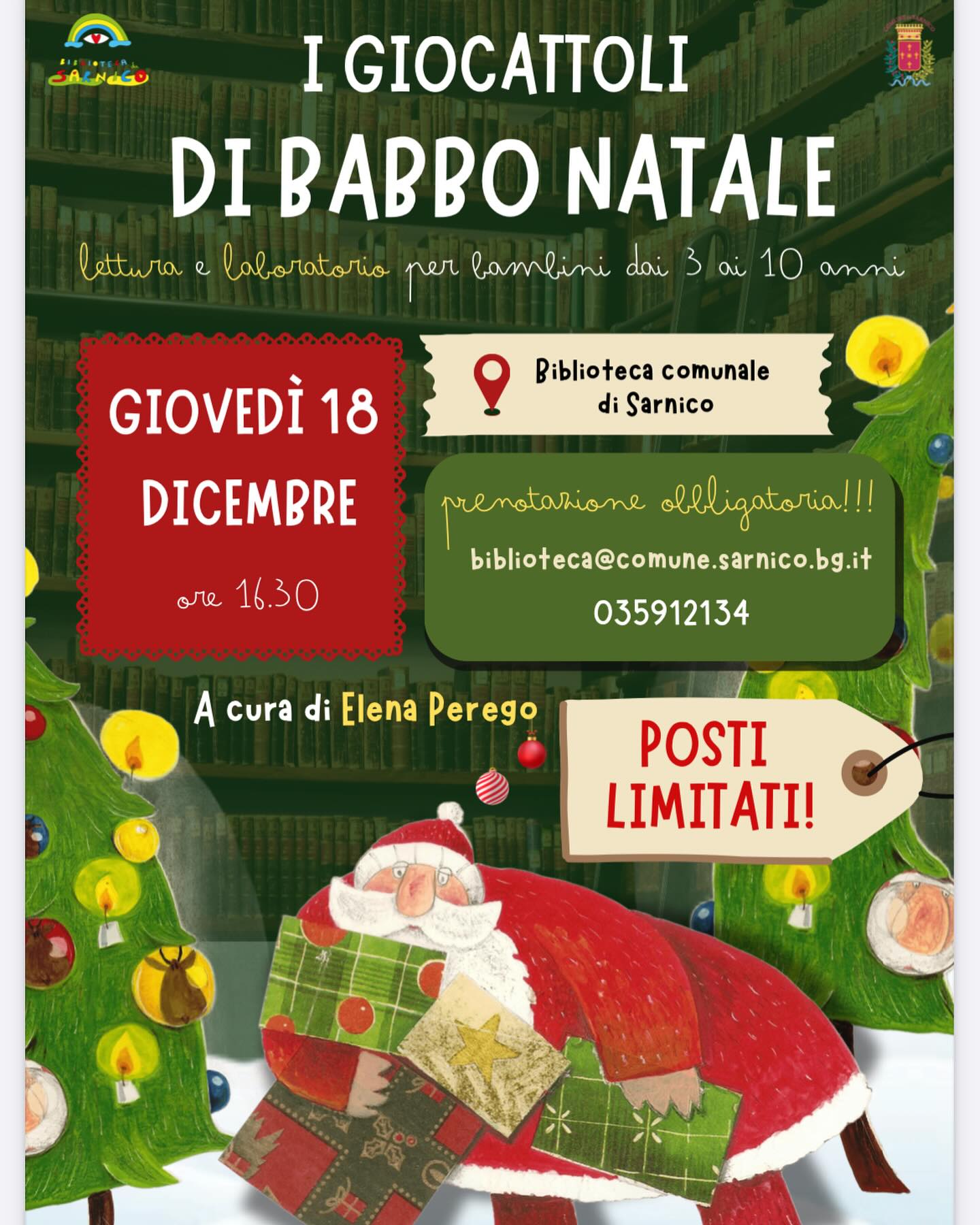 Giovedì 18 dicembre alle ore 16.30 la Biblioteca e l’assessorato all’Istruzione e alla cultura propongono “I giocattoli di Babbo Natale”, lettura e laboratorio per bambini 3–10 anni, a cura di Elena Perego. Un pomeriggio di storie e magia natalizia.