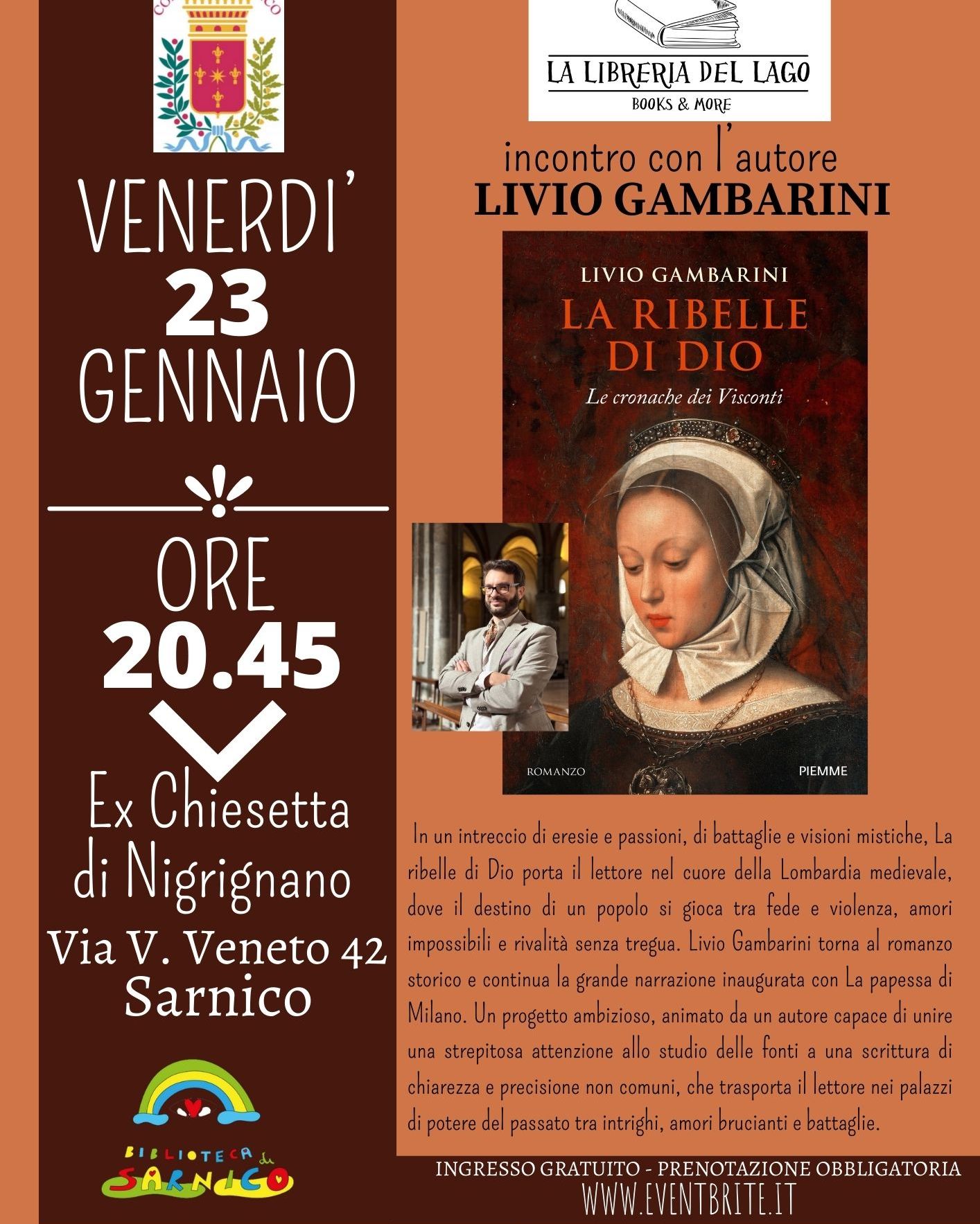 Venerdì 23 gennaio, alle ore 20.45, all’Ex Chiesetta di Nigrignano (Via Vittorio Veneto 42), Livio Gambarini presenta il romanzo La ribelle di Dio. Le cronache dei Visconti (Piemme), opera che segna il ritorno dell’autore al romanzo storico dopo il successo di La papessa di Milano.