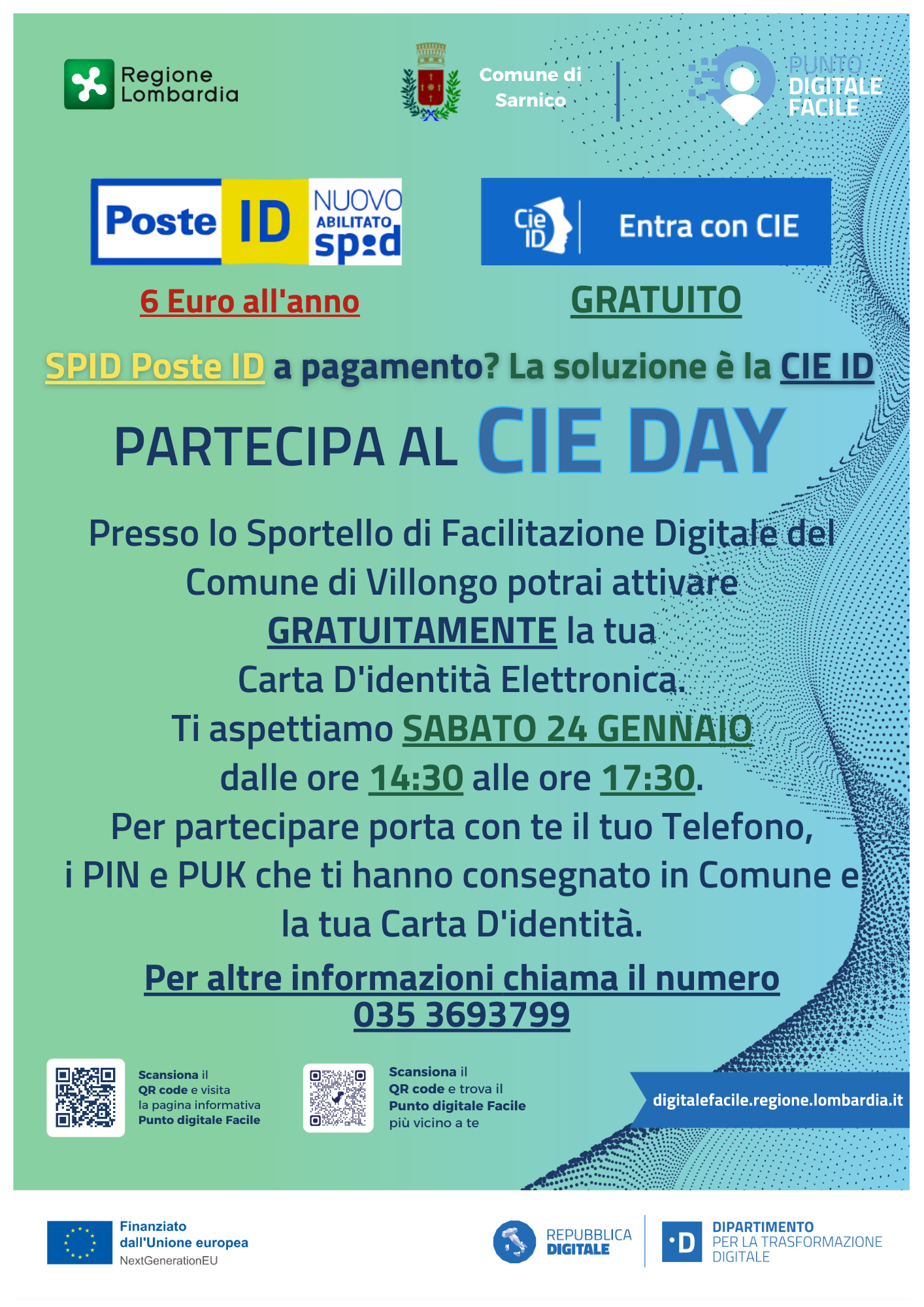 Sabato 24 gennaio, presso lo Sportello di Facilitazione Digitale del Comune di Villongo, sarà possibile attivare gratuitamente la propria Carta d’Identità Elettronica (CIE). L’iniziativa rientra nell’ambito del progetto Punto Digitale Facile, promosso da Regione Lombardia e finanziato dall’Unione Europea tramite NextGenerationEU, per facilitare l’accesso ai servizi digitali.