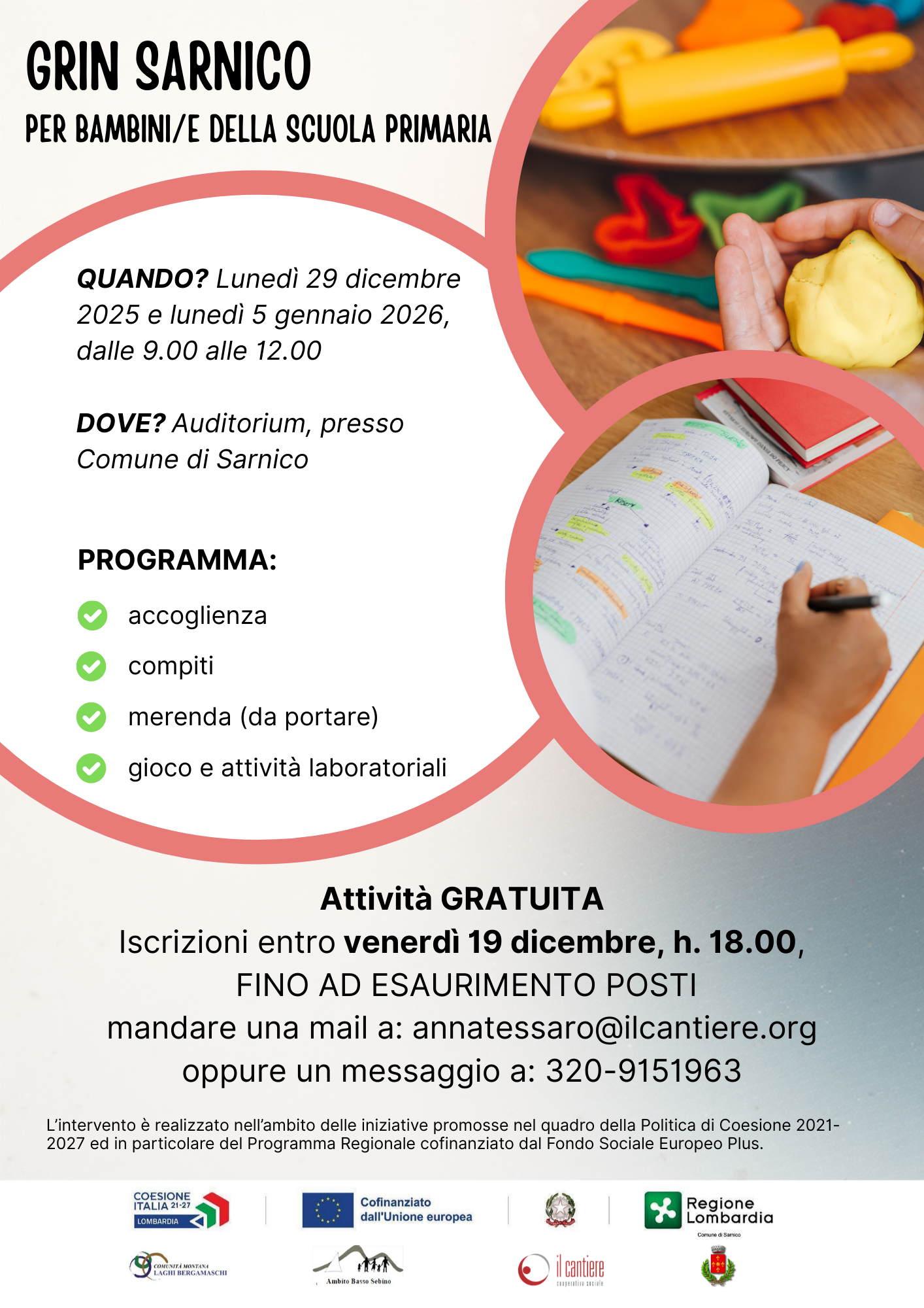 L’Ambito Basso Sebino, in collaborazione con Il Cantiere, promuove a Sarnico due mattinate di attività dedicate ai bambini della scuola primaria durante le vacanze natalizie.