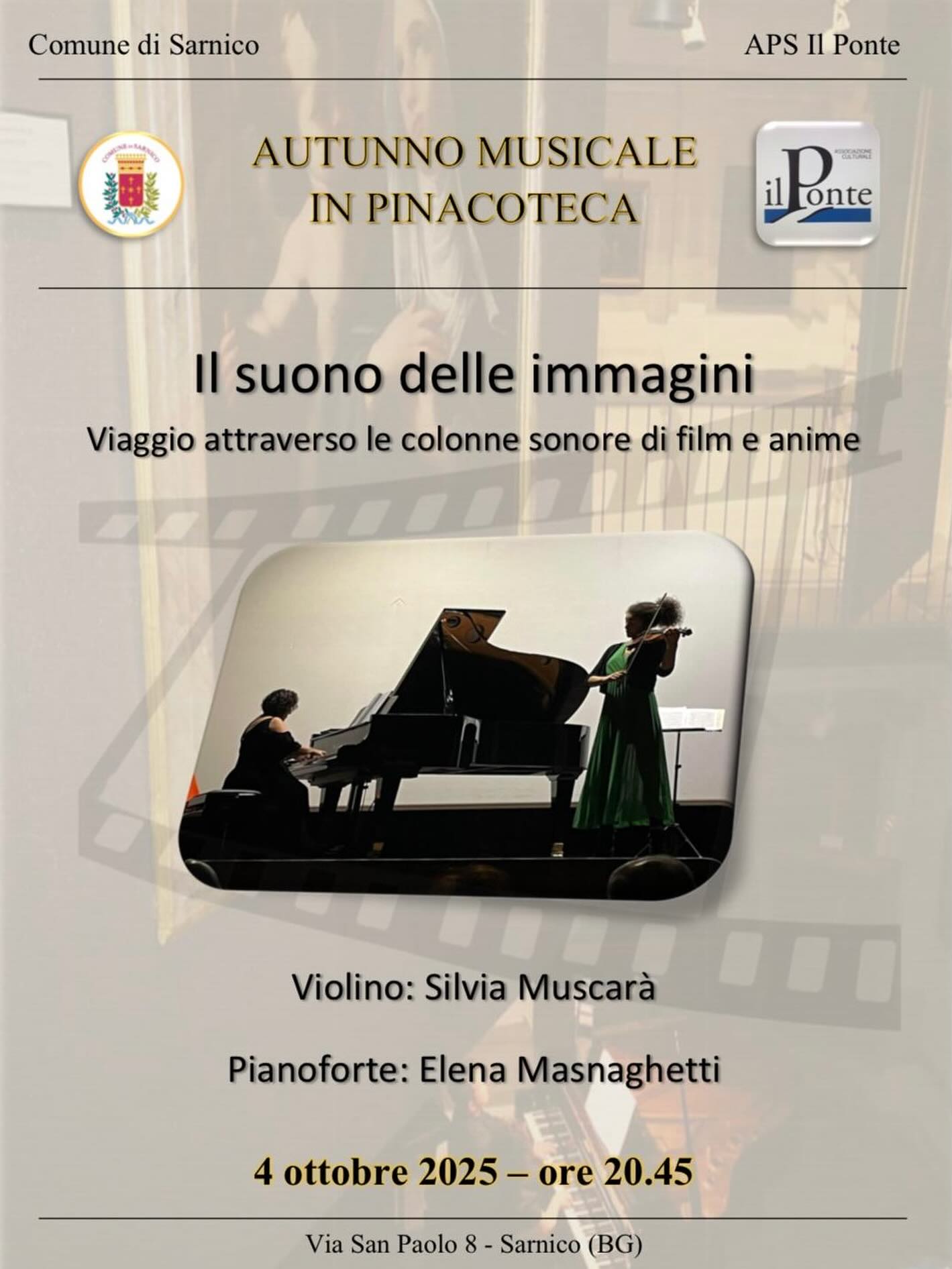Sabato 4 ottobre, alle 20.45 il Museo Gianni Bellini propone il concerto Il suono delle immagini: un viaggio musicale attraverso le colonne sonore di film e anime, con la violinista Silvia Muscarà e la pianista Elena Masnaghetti.